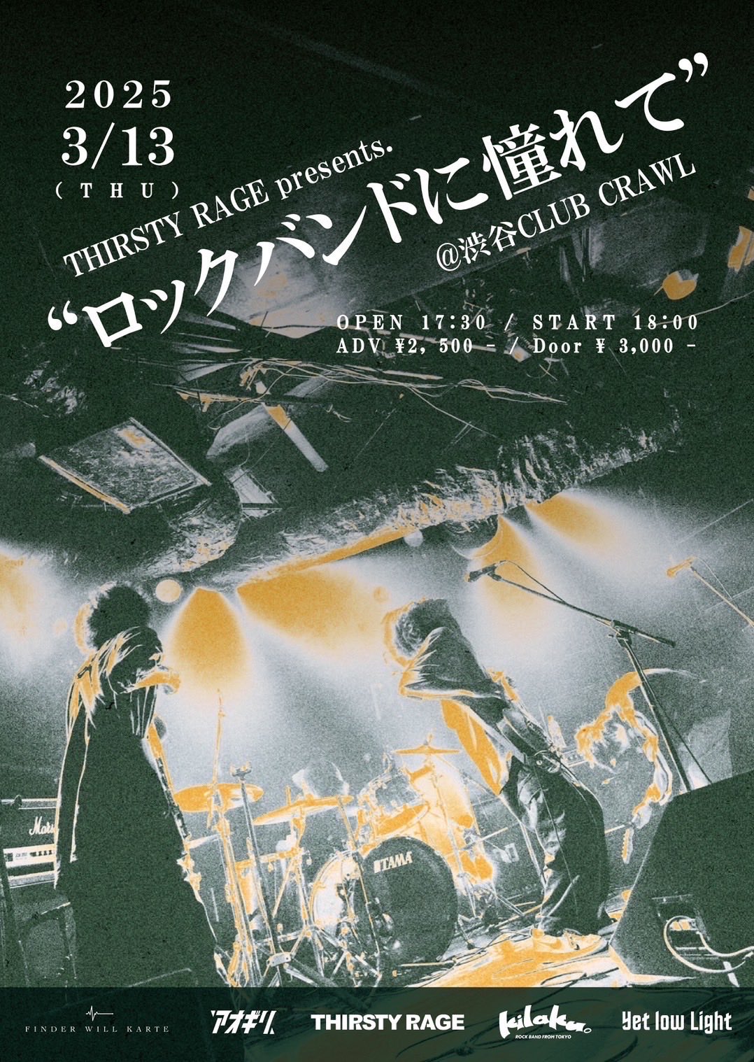 ロックバンドに憧れて 2025/3/13 2025/3/13 渋谷CLUB CRAWL OPEN 17:30 / START 18:00 ADV ¥2,500 / DOOR ¥3,000 (+1D ¥600) THIRSTY RAGE FINDER WILL KARTE Yet low Light アオギリ kilaku。 取り置きはこちら
