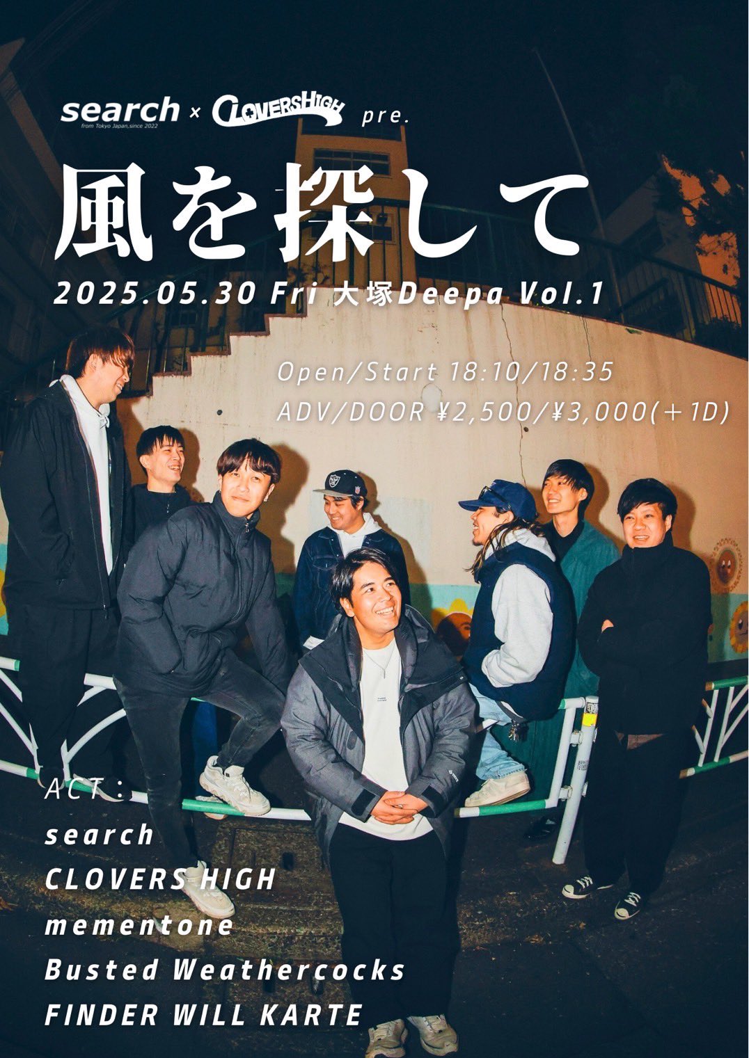 風を探して 2025/5/30 2025/5/30 大塚Deepa OPEN 18:10 / START 18:35 ADV ¥2,500 / DOOR ¥3,000 (+1D ¥600) search CLOVERS HIGH mementone Busted Weathercocks FINDER WILL KARTE 取り置きはこちら