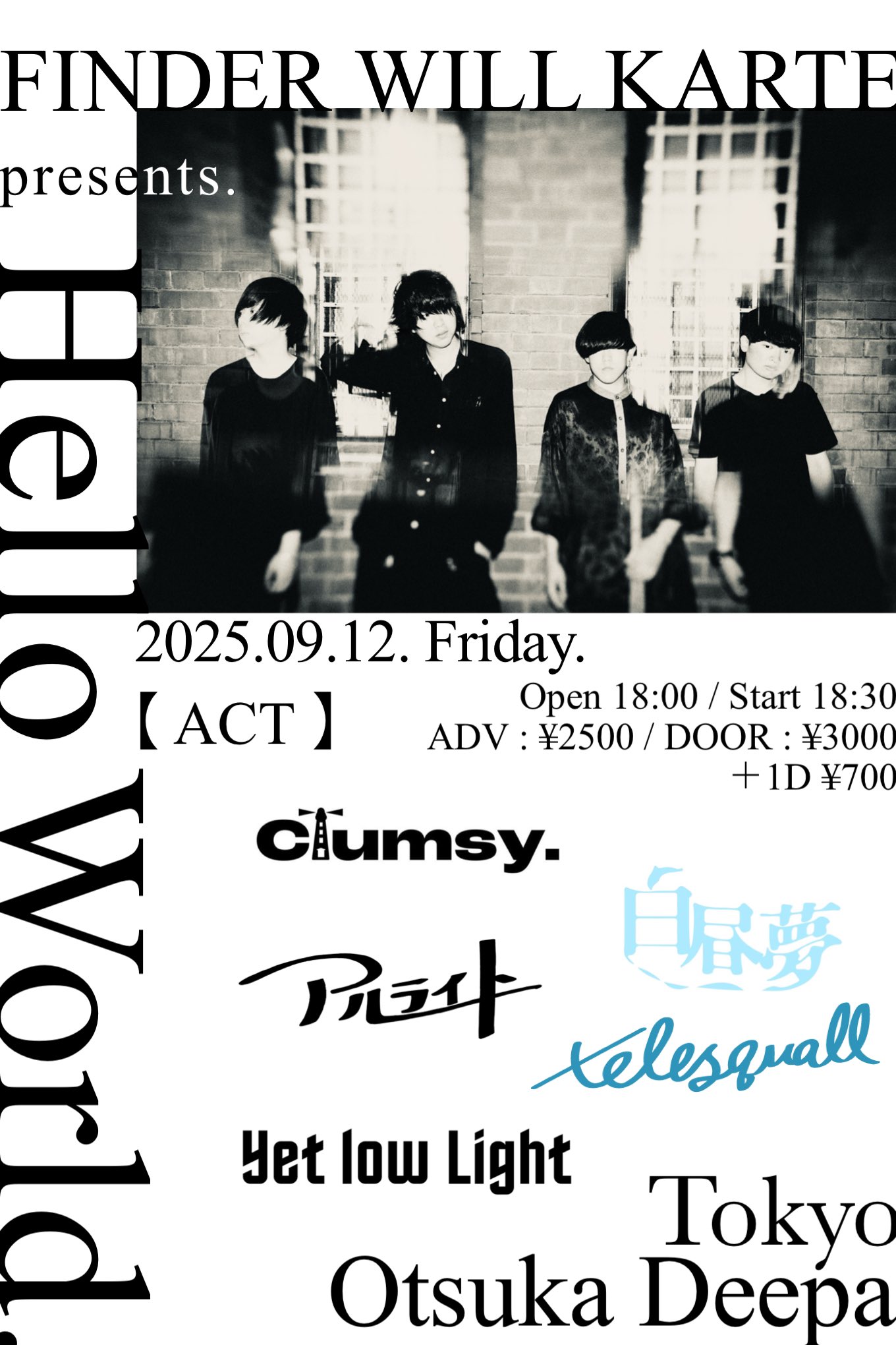 FINDER WILL KARTE presents.『Hello World.』 2025/9/12 2025/9/12 大塚Deepa OPEN 18:00 / START 18:30 ADV ¥2,500 / DOOR ¥3,000 (+1D ¥700) FINDER WILL KARTE clumsy. 白昼夢 アルライト telesquall Yet low Light 取り置きはこちら