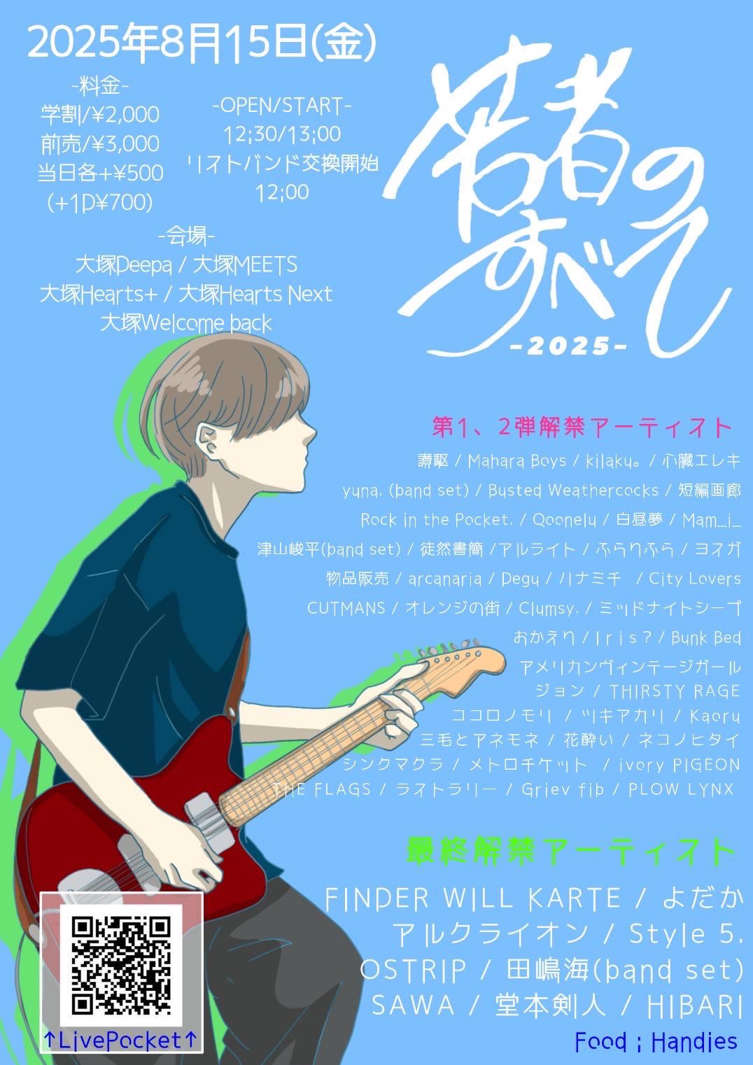 若者のすべて2025 2025/8/15 2025/8/15 大塚Deepa含むライブハウス各所 OPEN 12:00 / START 12:30 学割前売 ¥3,000 / DOOR ¥3,500 (+1D ¥700) 讃駆 Mahara Boys kilaku。 Busted Weathercocks PLOW LYNX 短編画廊 Rock in the Pocket. Qoonelu 白昼夢 Mam_i_ Degu 津山峻平(band set) 徒然書簡 ヨスガ 物品販売 arcanaria アルライト ふらりふら ハナミチ City Lovers CUTMANS オレンジの街 Clumsy. ミッドナイトシープ 心臓エレキ おかえり I r i s ? Bunk Bed 三毛とアネモネ 花酔い yuna.(band set) アメリカンヴィンテージガール ジョン THIRSTY RAGE ココロノモリ ツキアカリ シンクマクラ メトロチケット THE FLAGS ラストラリー Griev fib Kaoru FINDER WILL KARTE よだか アルクライオン Style 5. OSTRIP SAWA 田嶋海(band set) 堂本剣人 HIBARI リストバンド交換開始 12:00 取り置きはこちら